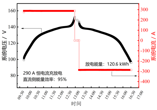 近日,膜工程中心主任李先锋研究员、郑琼研究员团队开发出100 kWh级磷酸盐基钠离子电池储能系统,并在山东滨州临港化工产业园区实现并网运行。该系统由1000余只36 Ah方壳电芯集成的28个模组,以及配套的电力控制模块组成。经现场测试,在290 A恒流条件下,该系统放电能量为120.6 kWh,直流侧能量转化效率超过95%。该系统部署在滨化集团碳三碳四综合利用项目中,与充电桩共同构成了“光--充”体系,在白天光伏大发时段可将余电储存,晚间用电高峰时段释放,避免因电网消纳能力不足导致的弃光,实现削峰填谷,降低用电成本。